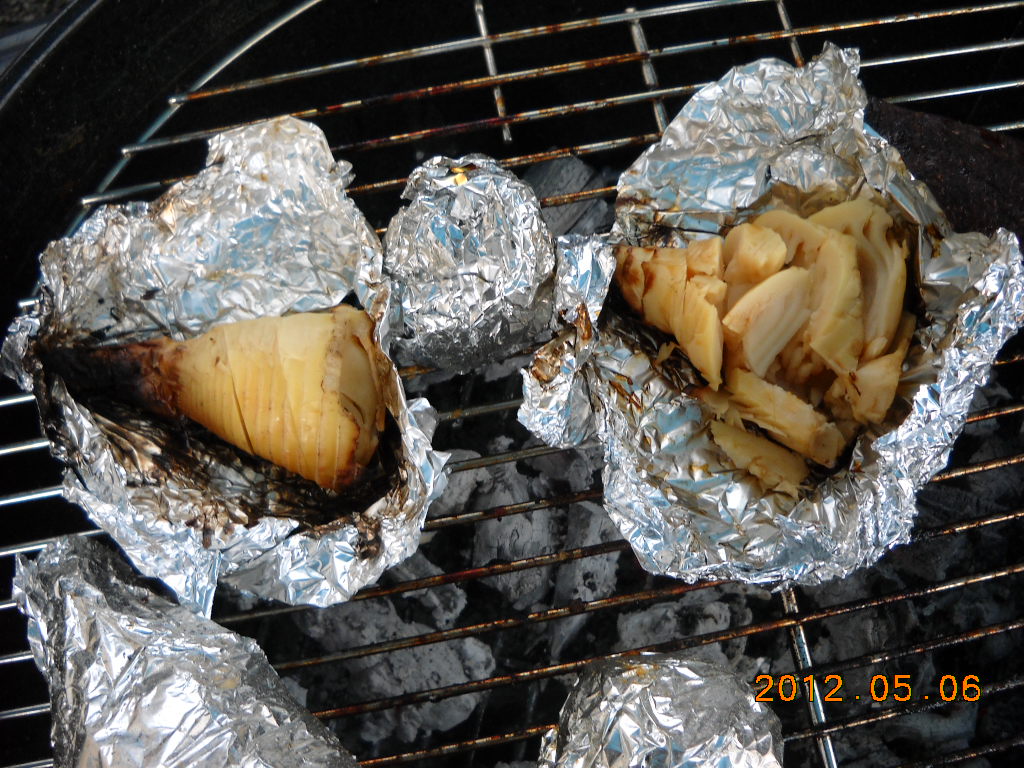 今朝堀った筍を蒸したり、