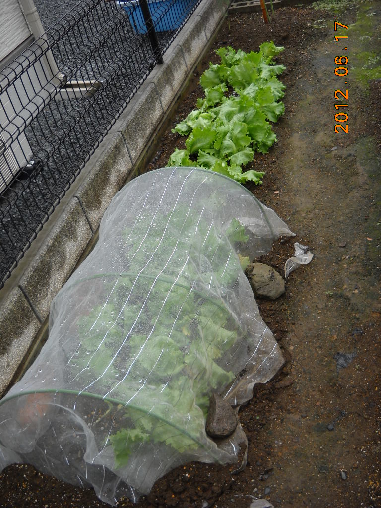 防虫ネットをかけた方の一株に青虫が大量発生(6.16)株ごと引き抜く。